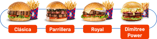 - La Promoción 2x1 aplica para las hamburguesas Clásica, Royal y Parrillera y una cuarta hamburguesa que cambiará a lo largo de la presente promoción. La hamburguesa se entregará en tamaño mediana y vendrá con papas de tamaño medianas. La segunda hamburguesa será del mismo sabor y tamaño (mediana) de la primera hamburguesa, y la segunda papa será del mismo tamaño (medianas).