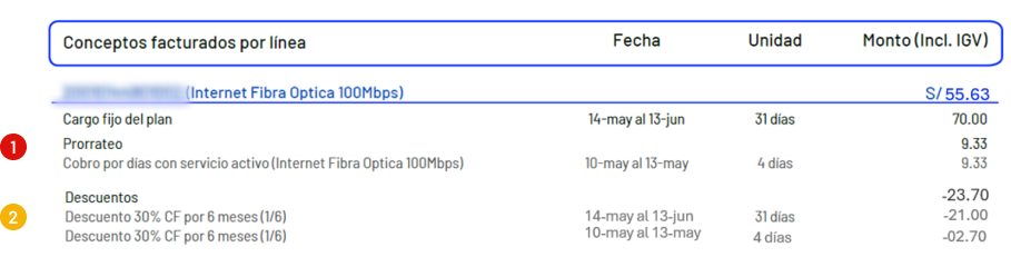 Es un descuento que se aplica sobre el cargo fijo del plan contratado. Es decir, si contratas el plan Internet Hogar Fibra 100 Mbps por los primeros 6 meses pagarás S/63 y desde el séptimo mes S/90 y si contratas el plan Internet Hogar Fibra 200 Mbps por los primeros seis meses pagarás S/84 y desde el séptimo mes S/120. Aplica prorrateo.